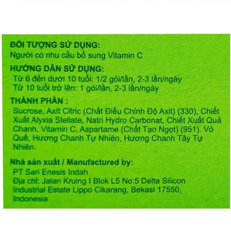 Sucrose, Axit citric (Chất điều chỉnh độ axit), Chiết xuất Alyxia Stellate, Natri Hydro Carbonat, Chiết xuất quả chanh, Vitamin C, Aspartame (Chất tạo ngọt), Vỏ Quế, Hương chanh tự nhiên, Hương chanh tây tự nhiên.
