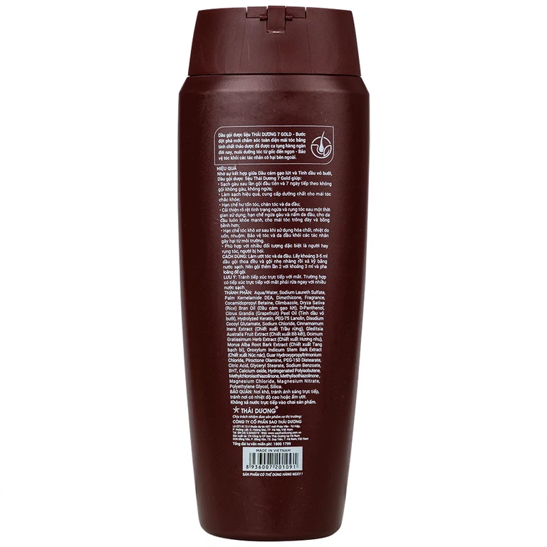 Dầu gội dược liệu Thái Dương 7 gold là dòng sản phẩm uy tín trong việc làm sạch da đầu, hỗ trợ loại bỏ gàu ngứa và ngăn ngừa rụng tóc với hiệu quả kéo dài 7 ngày liên tục. Sản phẩm cũng gây ấn tượng nhờ công dụng dưỡng ẩm, duy trì mái tóc suôn mượt, mềm mại.