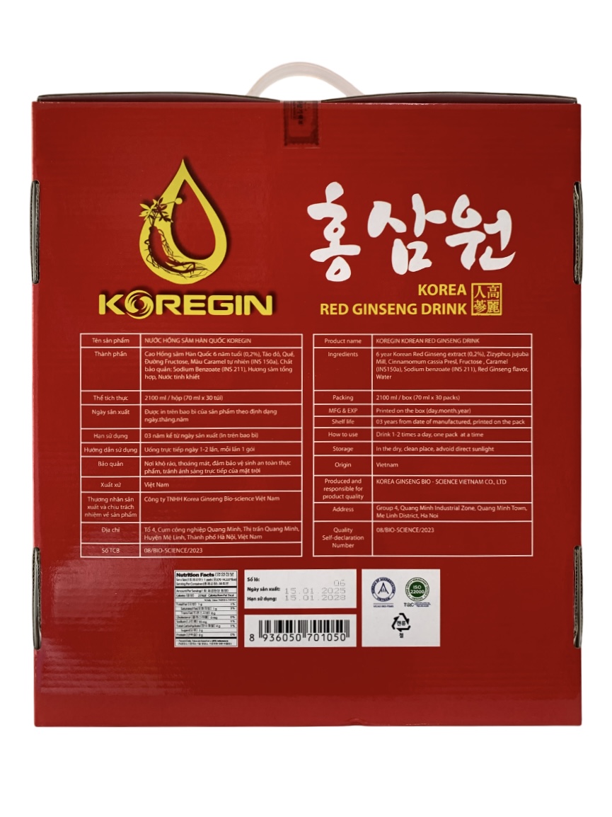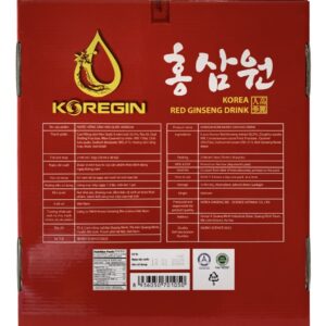 Cao Hồng sâm Hàn Quốc 6 năm tuổi (0,2%), Táo đỏ, Quế, Đường Fructose, Màu Caramel tự nhiên (INS 150a), Chất bảo quản: Sodium Benzoate (INS 211), Hương sâm tổng hợp, Nước tinh khiết.